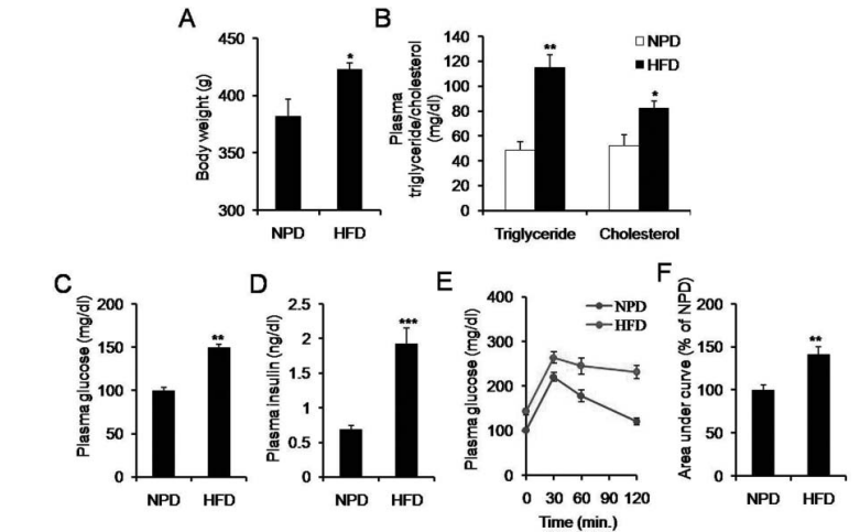 HFD feeding led to a significant increase in body weight, plasma triglyceride, and plasma cholesterol level. To examine the effect of HFD on insulin sensitivity, plasma insulin level and impairment in the glucose tolerance was examined. Significant (P less than 0.01) increase in plasma insulin (1.9 plus or minus 0.2 vs. 0.7 plus or minus 0.1 ng per dl) and glucose (149.3 plus or minus 4.5 vs. 100.0 plus or minus 3.4 mg per dl) level was observed in the HFD-fed rats as compared to the NPD-fed rats. Furthermore, HFD-feeding led to hepatic deposition of fat and impairment in the glucose disposal as compared to NPD-fed rats.