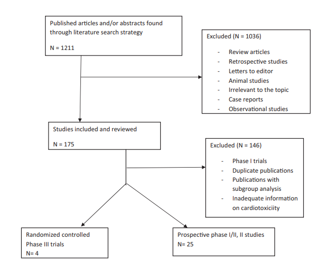 The primary goal of the meta-analysis was to calculate the incidence of cardiotoxicity secondary to Carf and to estimate the risk of developing cardiotoxicity. Only prospective trials published prior to January 2017 and written in the English language were included. Studies were included if the participants were assigned to treatment with Carf alone or in combination with other agents. Only those studies were included which had sufficient information on cardiotoxicity. A total of 32 phase I studies were excluded due to variable doses of Carf and relatively small sample size. One phase III study was included which did not have information about the control arm yet.